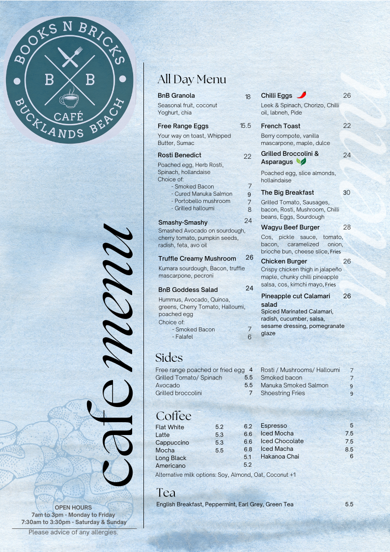 In a world full of chain cafés, Books N Bricks Cafe stands out as a beloved local gem, ready to provide not just coffee but an experience filled with connection, comfort, and delightful cuisine. So grab a book from their shelf, settle in, and make your way to one of Bucklands Beach's best-kept secrets.